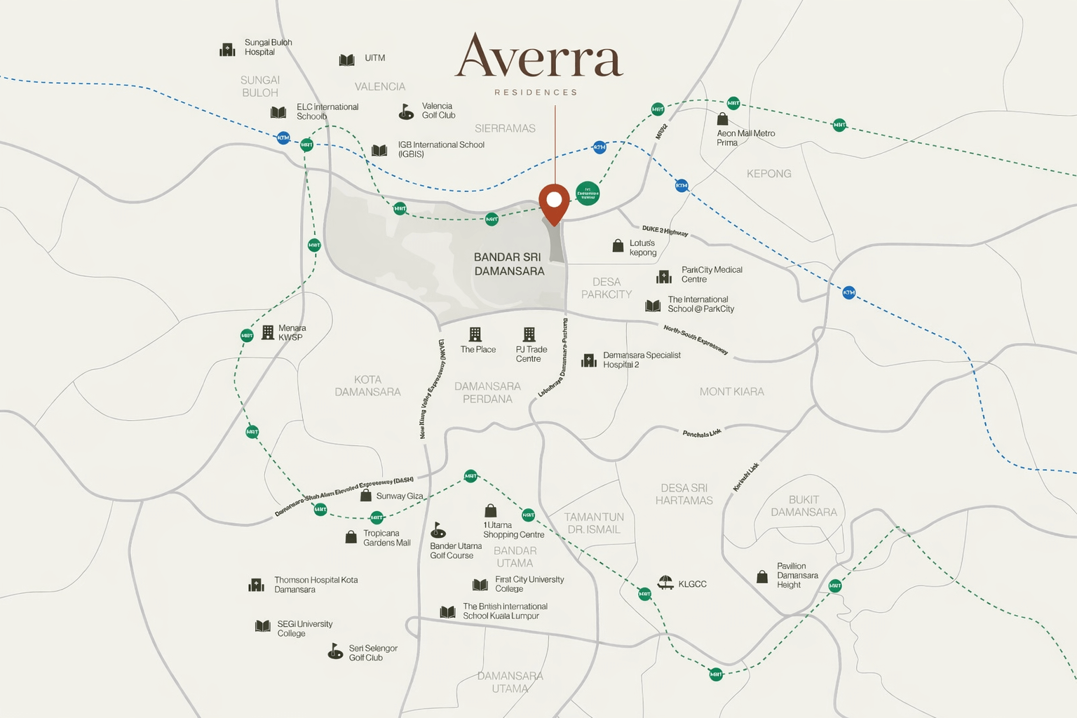 The development is strategically located near MRT stations, providing convenient connectivity to Kuala Lumpur, Petaling Jaya, and key employment hubs.